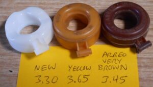 Dellorto SHA floats all say 3.5g (3.5 grams). The white new one weighed 3.30g, the light brown weighed 3.65, and the dark brown weighed 3.45. When exposed to stale gasoline they slowly get heavier and darker over time, as the plastic absorbs the gasoline components. When exposed to only air they get slightly lighter over time as the plastic outgasses trapped volatiles.