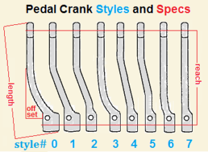 Offset: Ideally the pedal arms should have enough offset to not hit anything, even after being bent inward a little, yet not have too much offset. Too much offset causes the pedals to hit the ground sooner when leaned over, and to stick out more when parking or storing, and to hit the riders feet more when backing up.
