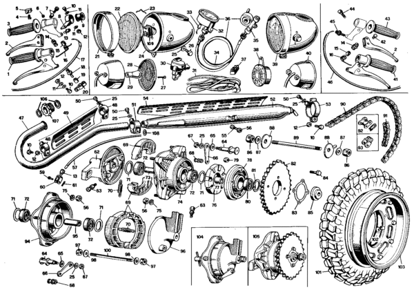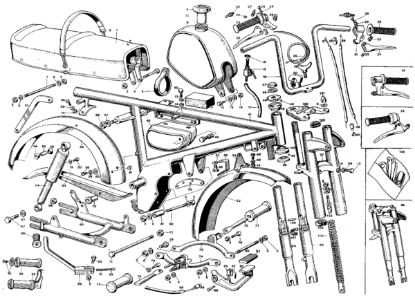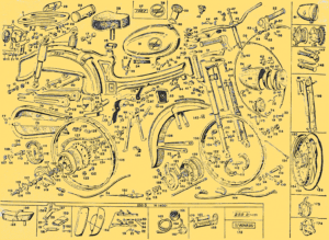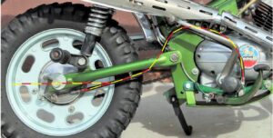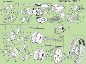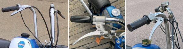 Benelli G2-US components: 2.25-16″ tires, 1.35-16″ rims, Benelli one speed automatic engine, Dellorto SHA 14/9 carburetor, #44 jet. Dansi 101813 magneto (external ignition ground type). CEV 2139 bullet head light, CEV 9400.2 tail light (with resistor for external ignition ground magneto), CEV plastic slide clamp-on switches, PV controls, Grimeca hubs (rear hub is special, has both chains on left side, Benelli only) and brakes, 11mm axles, Veglia speedometer with LH driver, 12×1 female gas valve with special long detachable handle-shaft that goes through a hole in the side panel, cables are all single-ended, seat post 25.0 x 22mm.