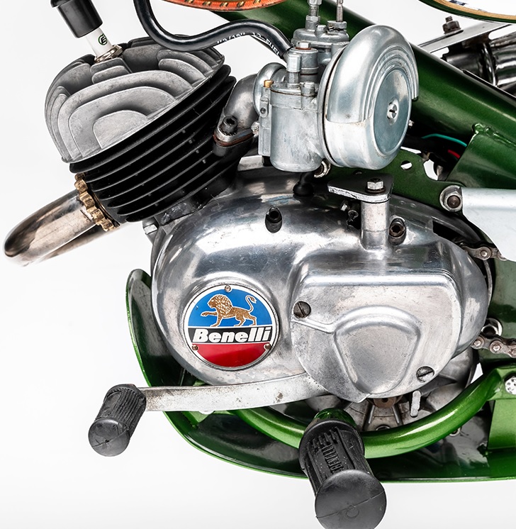 Benelli G2 engine specs: 40mm piston with same vertical dimensions as Morini, 8.5 comp. ratio, 25mph, 1.5hp at 4400rpm, 150mpg. sprockets 12 x 46T, trans oil 4 oz of 10w40 motor oil, fill plug on lower right is also oil level check plug.