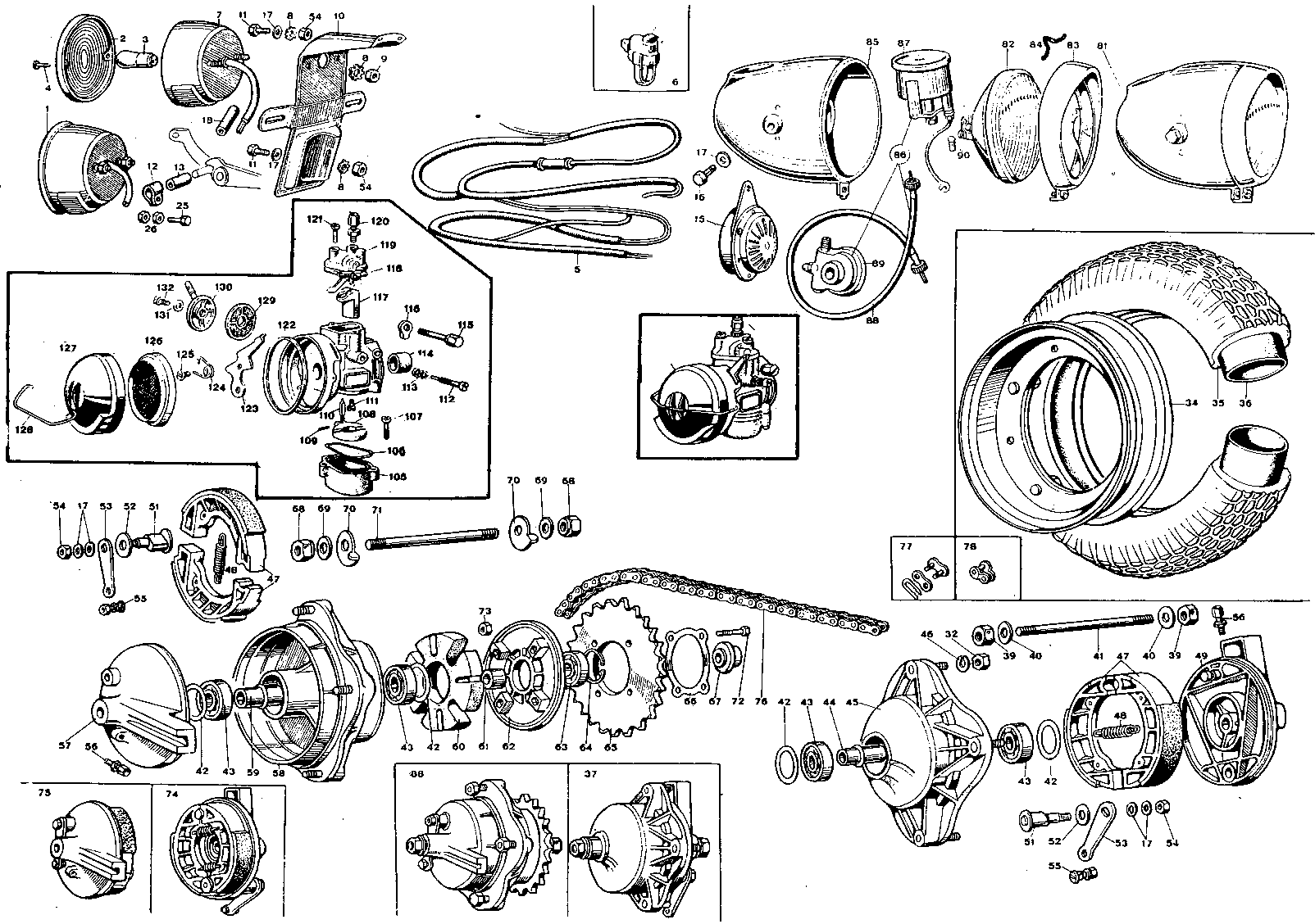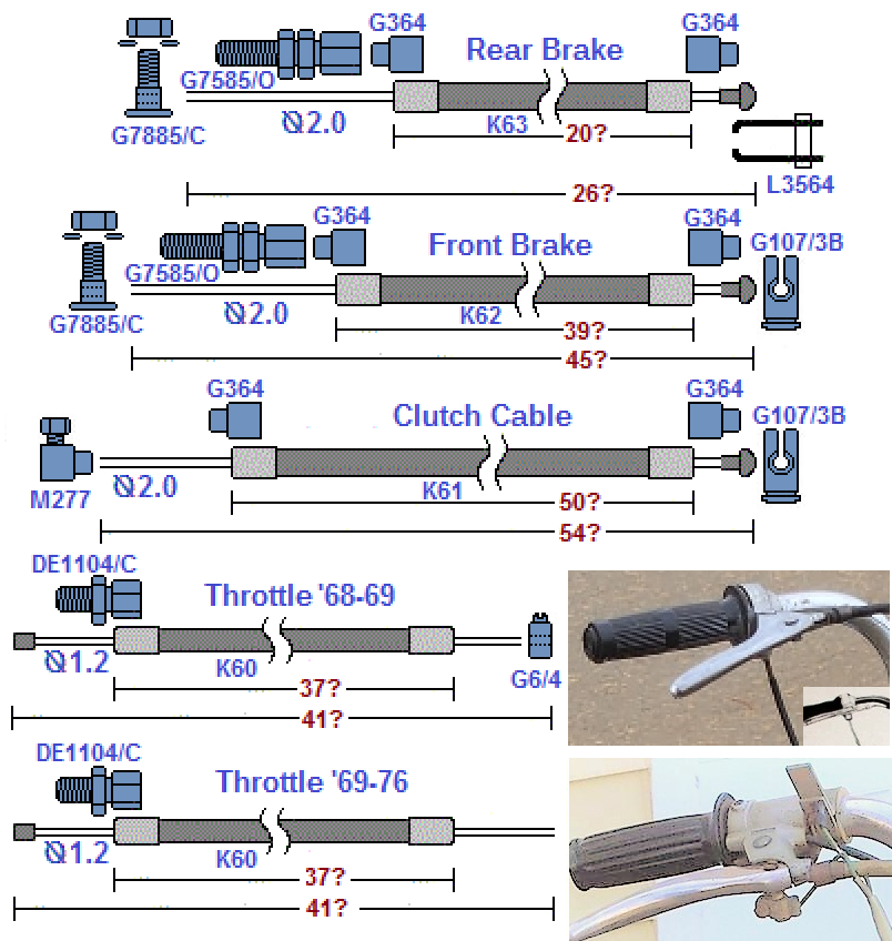 Benelli G2-US components: 2.25-16″ tires, 1.35-16″ rims, Benelli one speed automatic engine, Dellorto SHA 14/9 carburetor, #44 jet. Dansi 101813 magneto (external ignition ground type). CEV 2139 bullet head light, CEV 9400.2 tail light (with resistor for external ignition ground magneto), CEV plastic slide clamp-on switches, PV controls, Grimeca hubs (rear hub is special, has both chains on left side, Benelli only) and brakes, 11mm axles, Veglia speedometer with LH driver, 12×1 female gas valve with special long detachable handle-shaft that goes through a hole in the side panel, cables are all single-ended, seat post 25.0 x 22mm.