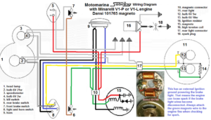 Soni Wiring: This 1980’s India remake of a 1970’s Italian made Vespa/Piaggio moped, has functionally the same wiring, pretty much, as Vespa did. Unlike the Kinetic, a 1990’s India made Vespa remake, that has a CDI ignition, the Soni has points, and an external ignition ground magneto that powers the brake light, like Vespa/Piaggio. When we say “ground the pink wire to get spark if the brake light filament burns out”, in India they say “earth when stop light is fused”. It looks like it has an emergency wire that would allow it to run if it lost spark from a blown brake light bulb or loose wire.