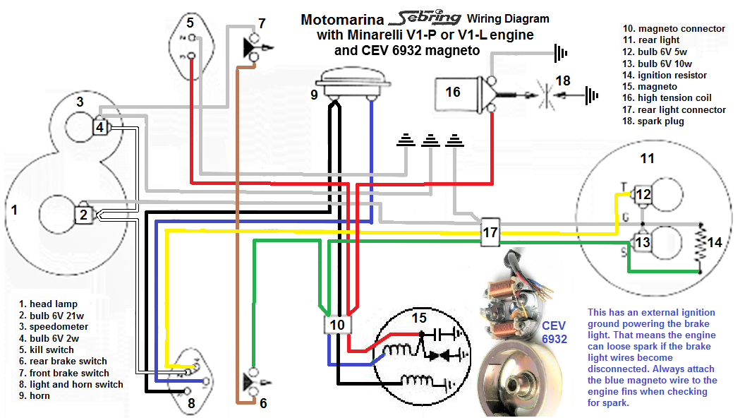 Sparta Wiring: Sparta had two 80mm magneto versions for the Sachs 504 engine, Bosch 4-wire and Motoplat 3-wire. The wires on the bike are the same, except Motoplat version has an external ignition ground, a tail light secret resistor, brake switch type NC not NO, and the brake switches wired in series, not parallel. The Motoplat version needs the brake light wires and correct bulb to have spark.