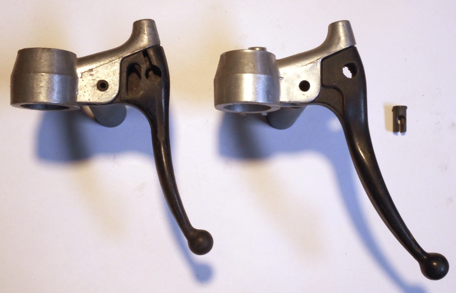 P.V. is an Italian moped lever, used on Benelli, Guzzi, Intramotor Gloria, Testi, Rizzato and other Italian mopeds. None of the parts interchange with Domino. The lever blades are all black plastic, as are the throttle twist tubes. The housings are cast aluminum. The housings break easily when the bike falls over. Instead of a pivot bolt they have a press-in 6mm roll pin.
