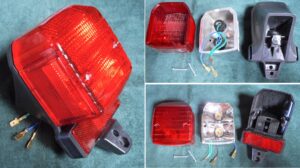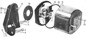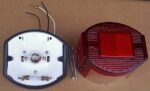 CEV 9350: Many 1972 -1976 US mopeds, and some Italian scooters and motorcycles, had this “oval with flat sides” single bulb lamp. It meets 1972 US DOT requirements of having a brake light and shining to the sides. Original USA 9350 versions also had red lenses with side reflectors. Rear red side reflectors were required, but they did not have to be part of the light.