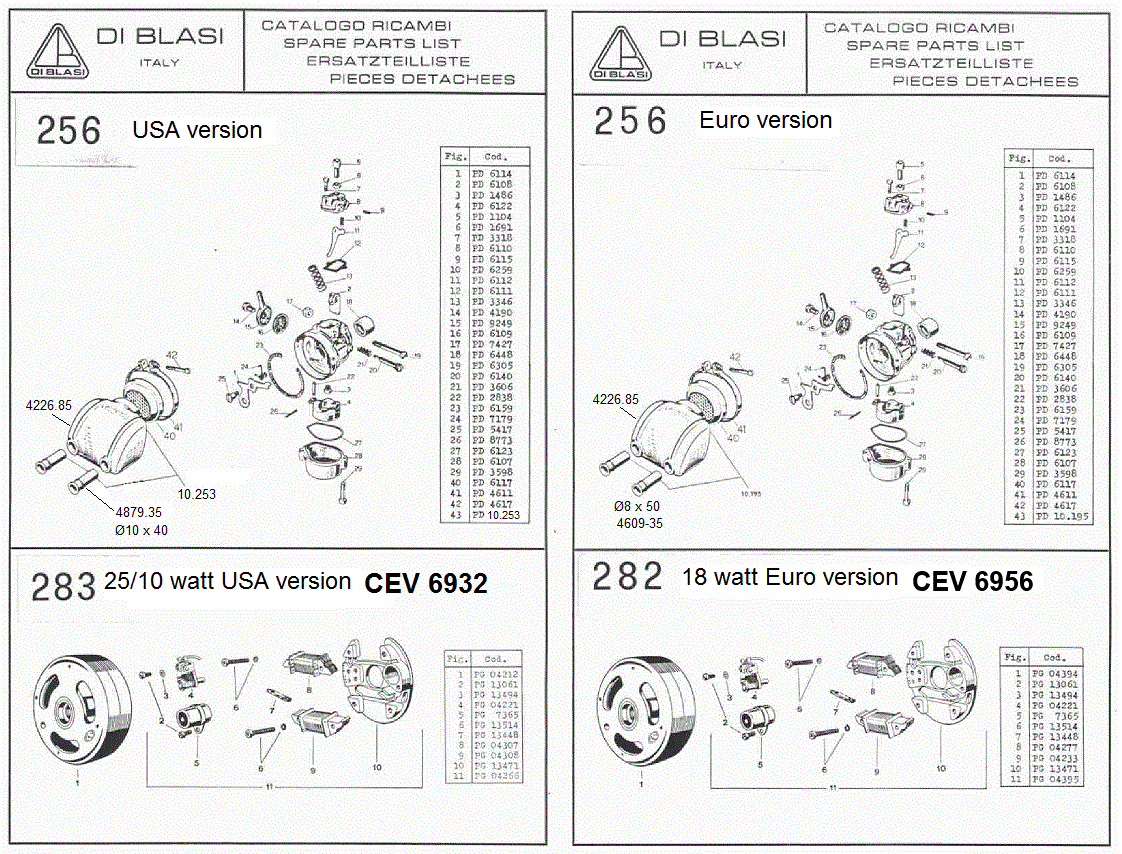 Here are five Di Blasi R7 parts catalogs, each with two versions, and one Di Blasi R2 catalog. They are combined into one list, using thirteen model columns. Each model column contains, for each part number, the part quantity.